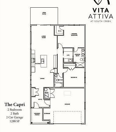 interior spaces, front porches, patios, customizable interiors, attached garages and a shared community center boasting the speakeasy, party room, pickle ball courts, tennis courts and in-ground pool. The Capri is perfect for those looking for an easy to manage space that still offers luxurious finishes, and open floor plan and an efficient use of space. This home boasts our trademark covered front porch, lanai doors to the back patio and custom finishes