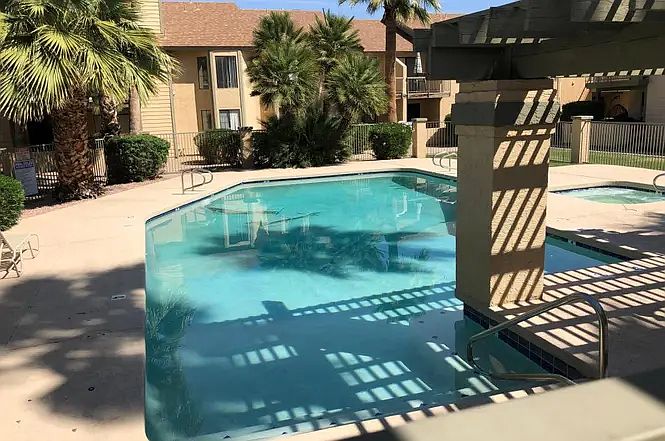 Quiet neighborhood on Peoria/Glendale border, 5 minutes to Glendale CC/ AZ State. 2 covered parking spots are steps away from stairway. Community pool, hot tub and playground. Water included in rent and W/D inside unit.