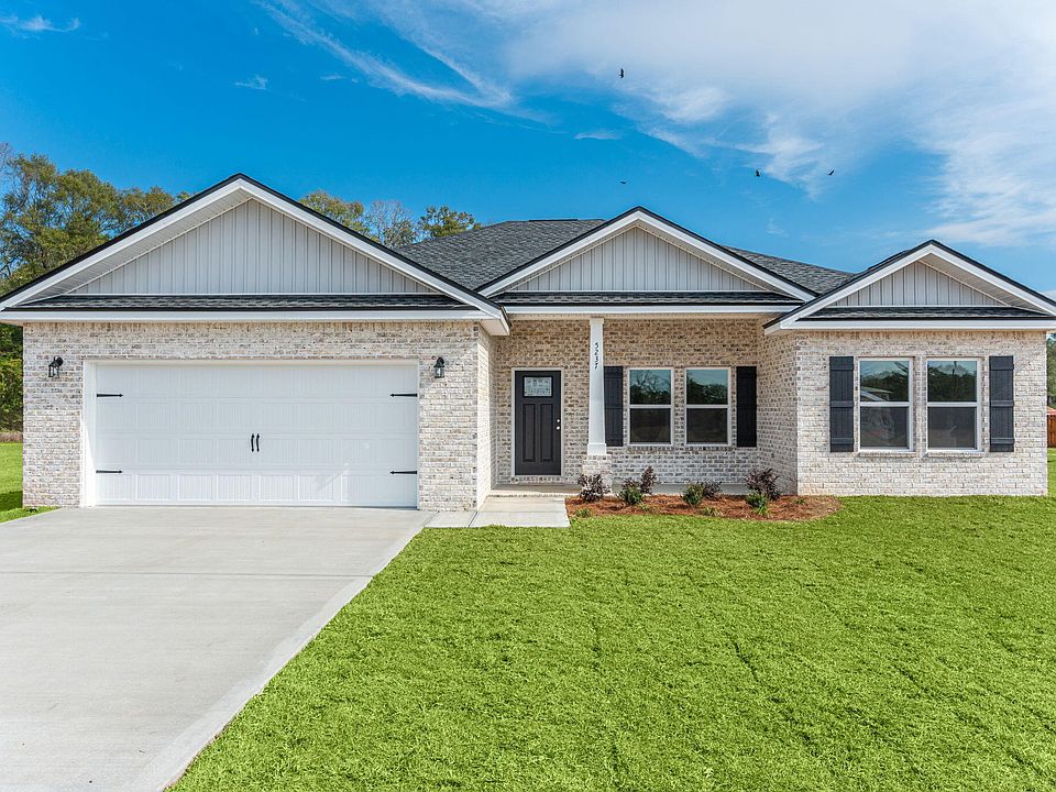 ROOM TO ROAM IN THIS NEW HOME-1.55 ACRE -All brick construction with cozy front porch and covered rear porch. Open floor plan boasts raised ceilings with recessed lighting, ceiling fans in all bedrooms and living room. Foyer leads you to family/kitchen/dining area, kitchen has white shaker style cabinets, work island with bar seating, pantry and dining area, quartz or granite countertops, owners suite is located right off kitchen & has double vanities, shower and walk-in closet in bath, laundry room, additional bedrooms are good size, additional bath has double vanities as well. Luxury vinyl plank in all common areas, carpet in bedrooms. Home can be completed 90 days from acceptable contract, call for details on seller contributions.