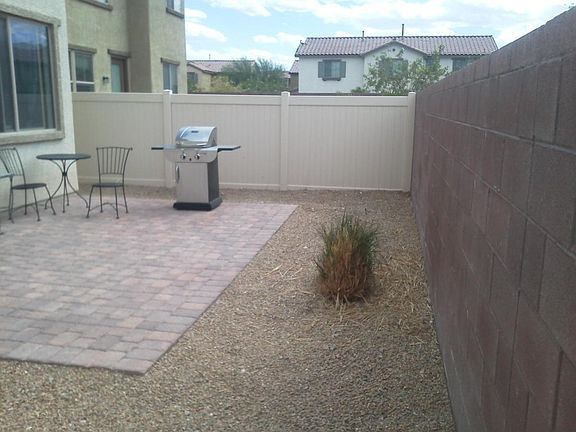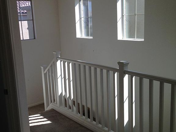 Gated community home w/ community park & pool, minutes from Nellis AFB, desert landscape front & backyard. The home has an open floor plan downstairs with a living and dining area, a front kitchen, guest bathroom and patio door to the yard. The kitchen has a breakfast bar, granite counters, fridge, stove & lots of cabinets. The living room has new vynil planks and the dining area has tile flooring and a hanging chandelier. The attached 2 car garage has auto door opener and direct entry to the home. Upstairs are the 3 bedrooms, 2 full bathrooms and the laundry room.The 2nd bedroom is at the top of the stairs and has a ceiling fan with light. The large master bedroom has blinds on the windows and a ceiling fan with light. The master bathroom has a double sink vanity with a tile counter, separate shower with a glass surround, garden tub, large walk-in and a water closet. The full bathroom has a tub shower combo. The third bedroom has a ceiling fan with light.