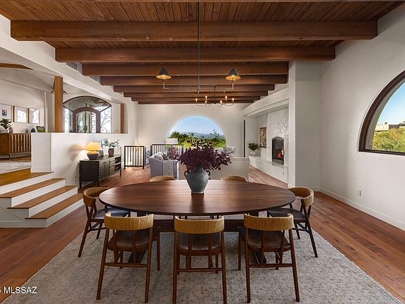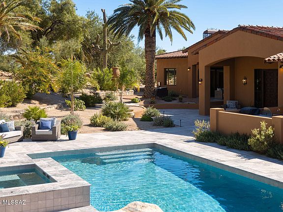 Unique Santa Barbara Style home fully re-built in 2024 with attention to detail. It features a flexible floorplan with space for many options. The recent addition includes a homey but beautiful family room, gourmet kitchen, bespoke powder room with an amazing scullery/pantry area that all makes a perfect gathering place. The oversized hallway has built in desks and shelving which is as attractive as it is functional. The living dining room features high beamed ceilings that draw the eye to a picture window and magical city lights with views to downtown-which are also featured on the back deck. There are 3 bedroom suites each uniquely designed and laid out on the main level. Downstairs is a flex room that could be easily accessed as a home office with an additional bedroom and full bath Newly added...a pickleball court which will provide a hub for entertaining and keeping fit! Bring friends and family to play in the beautiful Tucson desert with the pool, pickleball, basketball, outdoor barbecue includes a pizza oven, neighborhood country club, tennis courts, restaurant, work out facility and golf course. The exterior has an abundance of niche spaces for enjoying the beautiful setting but none more dramatic than the pool with its majestic mountain views. So close to shopping, restaurants and activities. Inside and out this classy up-dated property is unique in any location but especially rare in Tucson.