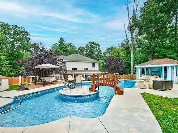 The large private heated pool having 3.5' to 8' depth and a island, surrounded by the nature and trees.