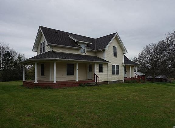 Farm Style updated family home with 3 covered porches. Many updates and natural gas coming in future. Large living areas, dry basement and modern kitchen and bath rooms. 4 Bedrooms, One main floor bedroom, and 3 or 4 more upstairs with gleaming natural wood floors and woodwork. People and Pets can enjoy 10 acres of rolling land with hay barn, assortment of smaller buildings formerly housing machines and animals. Secure buildings and the iconic milk house by the road ready to be re-purposed as a garden shed or hobby space. There is no formal garage but plenty of opportunity to re-purpose one of the nearby buildings as a spacious garage. Come look at this well priced property, bring your imagination. Current crop harvest is property of the farmer. New tax description and legal. Property is an estate and price it is being offered at is from appraisal. Please note: Cash or Conventional Mortgage only.