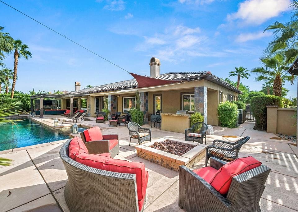 Welcome to your private desert sanctuary, an exceptional estate offering comfort, privacy and luxury in every detail. The stunning 4-bedroom, 5-bathroom main residence features expansive living spaces and exquisite finishes throughout, including a chef's kitchen with brand-new appliances, granite countertops, and ample cabinetry designed for culinary excellence.A spacious detached one-bedroom casita with its own living room provides the perfect guest retreat or private office space.Step outside to a resort-style backyard complete with a 60-foot saltwater lap pool, ideal for both leisure and fitness. The fully landscaped grounds offer serene desert beauty, while multiple outdoor lounging areas invite relaxation and entertainment.The oversized primary suite is a true retreat, showcasing a dual-sided fireplace, sitting area, and two generous walk-in closets. Two additional guest bedrooms offer en-suites and a fourth guest bedroom creates a perfect blend of elegance and functionality.Additional highlights include an attached 3-car garage plus a separate detached 2-car garage ideal for car enthusiasts or extra storage. The entire estate is immaculately maintained, with a rare combination of modern amenities, timeless style, and unmatched privacy.Experience the ultimate in desert luxury, schedule your private showing today.