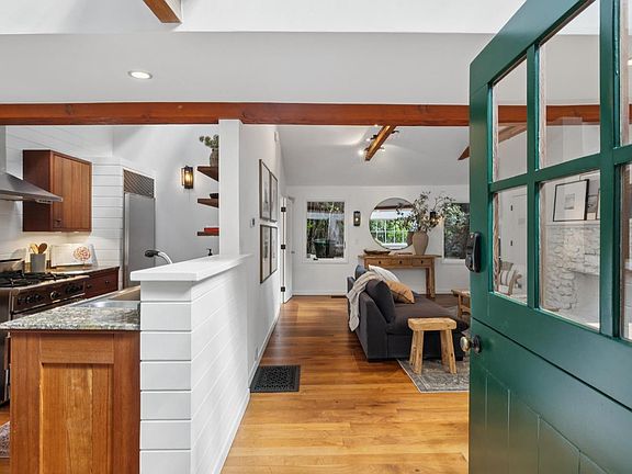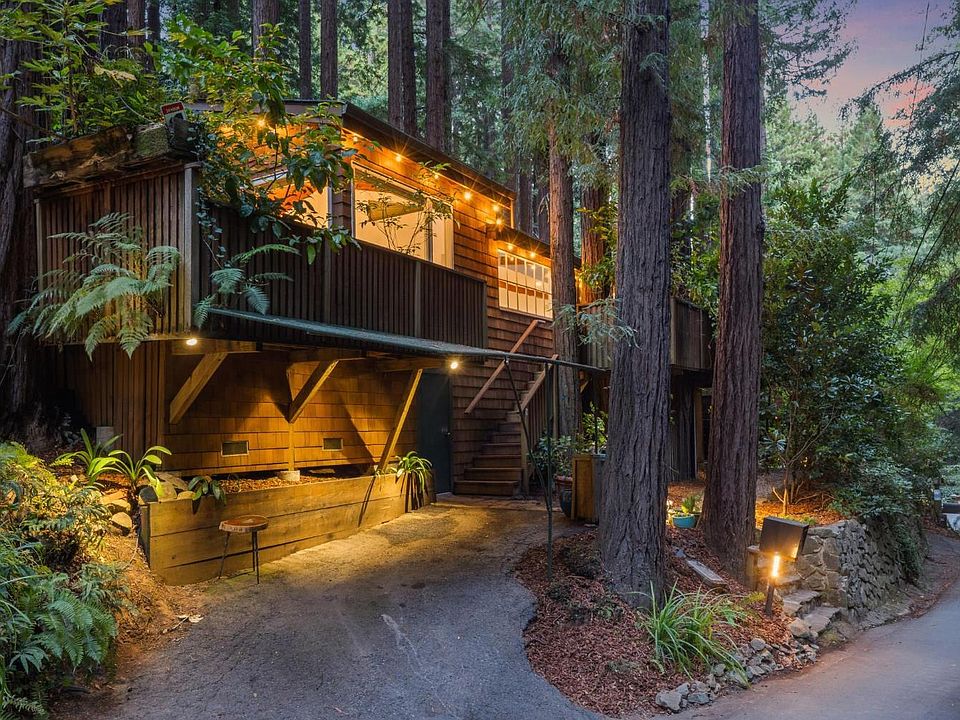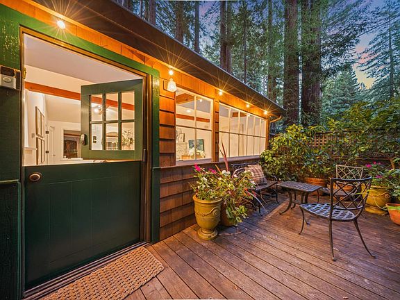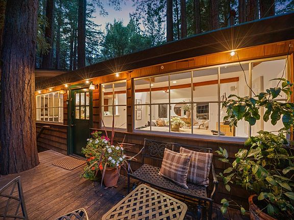 Tucked away beneath a canopy of majestic redwoods, this thoughtfully designed Mill Valley home blends modern sophistication with rustic charm. Sunlight pours through expansive skylights and picture windows, creating a seamless connection between the indoors and surrounding nature. The living room features vaulted ceilings with exposed beams, wide-plank hardwood floors, and a striking whitewashed stone fireplace as its centerpiece. The open-concept dining area is framed by walls of glass and skylights with views of lush greenery just beyond. The kitchen features custom cabinetry, stone counters, high-grade appliances, and open shelving that balances style and function. The spacious primary suite has soaring wood-clad ceilings, an elegant chandelier, and private access to the outdoors. Additional highlights include a guest bedroom, flexible spaces, and the home's showpiece: a greenhouse-style lounge perfect for gathering, relaxing, or simply soaking in the natural surroundings. The outdoor spaces are equally picturesque with multiple decks, potted gardens, and intimate seating areas surrounded by nature. This home offers the ideal balance of retreat and connection, tucked away in privacy yet just moments from downtown Mill Valley.