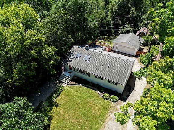 Welcome home to this brick ranch nestled on a tree-lined lot offering a blend of charm & modern comfort. Vaulted ceilings with two newer large skylights (2022) fill the area with natural light as you enter. Fresh paint, floor to ceiling built in shelving, and a large picture window offering views of the front yard create a bright and welcoming atmosphere. The open-concept living and dining space flows into the kitchen providing modern stainless steel appliances, granite countertops, and plenty of cabinets. Main level painted 2025 offers 2 bedrooms & a full bathroom with shower plumbing replaced in 2023 and new toilet + plumbing in 2024. Large, full finished basement has a newer half bath (est 2019) and a freshly painted 3rd bedroom. Oversized laundry room with utility sink and storage shelving. 3 season sunroom fully renovated in 2022 is perfect for morning coffees and summer entertainment with views of the deck and a naturistic, large fully wood-fenced yard. A deep 2-car detached garage and extended driveway provide plenty of parking and storage space. Goose Lake beach activities, playground, and elementary school is one block away! This move-in-ready home is the perfect retreat with easy access to all the amenities Lake in the Hills has to offer. **Garage repaired (June 2025) with warranty. Exterior access (clean out) for sewer line added (June 2025). Electrical Panel Box 2021. Roof estimated 2018/19. Water heater 2017. Furnace 2012 & Energy efficient AC 2024 serviced June 25, 2025.**