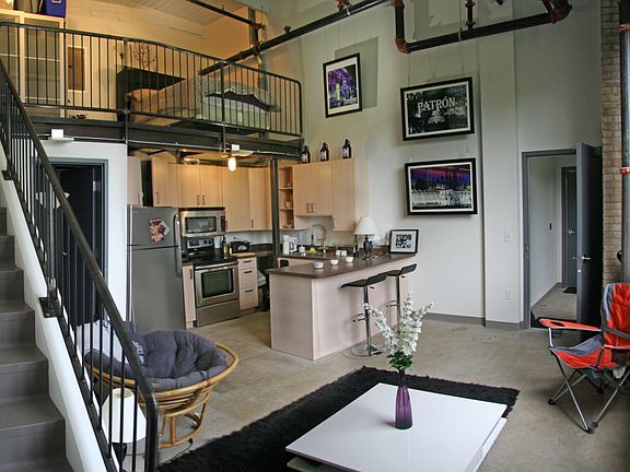 This loft style apartment has a unique floor plan that embraces the features of this 1939 restored factory. Apartment features include barrel roof wood ceilings that span to 18 ' above the living room, exposed brick walls and loft bedroom area. The open concept is approximately 650 square feet and include washer/dryer, dishwasher, kitchen with lots of storage, spacious, secured back yard with hard lined gas grill, patio furniture and canopy parking.