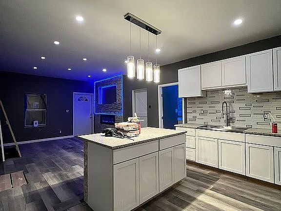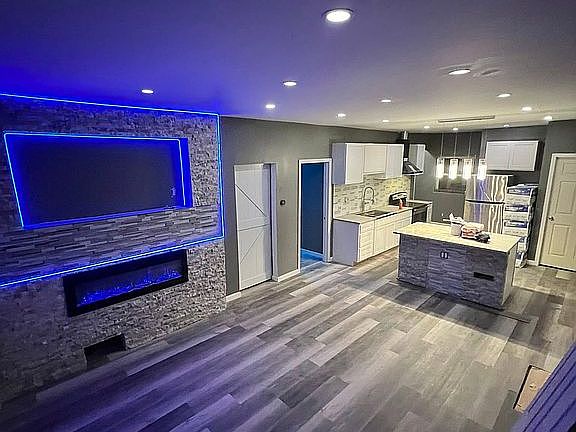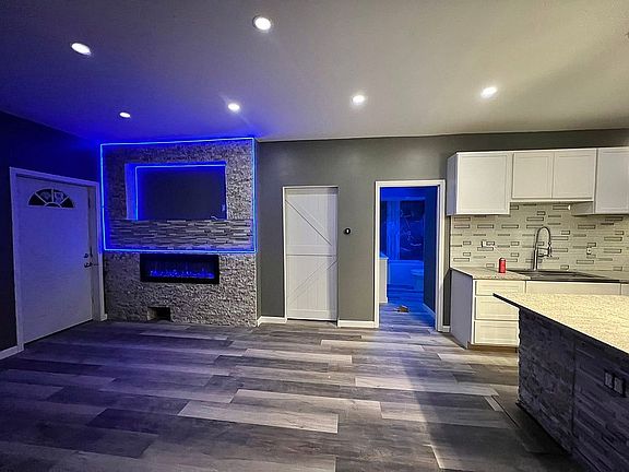 Upstairs, you’ll find two bedrooms with new vinyl flooring throughout, a modern custom-built fireplace that perfectly complements the kitchen island, and an open-concept living room that flows seamlessly into the kitchen. The kitchen is a chef’s dream, featuring a motion-sensored hood range, granite countertops, farmhouse-style deep sink, and mosaic tile backsplash, ideal for cooking and entertaining. Recessed lighting with motion-touch dimmer switches throughout adds a sleek, contemporary feel.