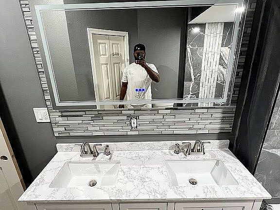 The upstairs bathroom offers a deep porcelain-tiled tub, modern double vanity with LED mirror, and Bluetooth speaker lighting, creating a true spa-like experience.