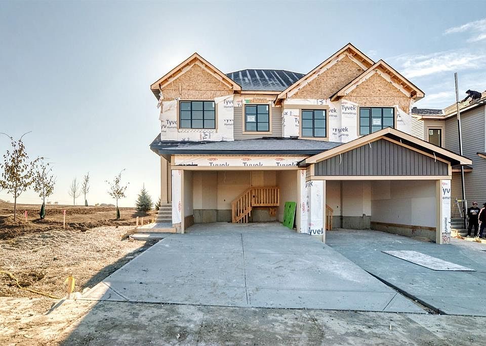 ** Open House Saturday October 25 & Sunday October 26 12-3pm ** Discover the Cambridge by Paragon Custom Homes. A stunning 1,895 sq ft corner duplex situated on a premium lot with a park right beside you in the desirable West Hawk community. This beautiful home offers abundant natural light and 9ft ceilings throughout. Inside, you'll be greeted by a bright foyer with engineered hardwood flooring and large windows. The walkthrough mudroom with built in storage connects effortlessly from the double attached garage into the pantry, keeping you organized. The spacious kitchen features stainless steel appliances, quartz countertops, a generous island, and custom cabinetry. A large main floor office with feature walls provides versatile space for work, study, or a cozy playroom. Relax in the inviting living room with a electric fireplace, or step out to the deck and backyard. Upstairs, you'll find a great bonus room, two generously sized bedrooms, a family bathroom, laundry room with convenient built in storage, and the primary retreat boasting a vaulted ceiling, a luxurious 5-piece ensuite with a soaker tub, and a walk-in closet with custom built ins. An additional side entrance offers extra convenience for future developments or separate living spaces. Located close to schools, educational facilities, a variety of amenities, and easy access east to Calgary and west to the mountains, this home combines modern updates with classic charm in a sought after neighborhood. Just minutes from excellent dining, green spaces, and river walking paths, this remarkable property is ready for you to call home. Don’t miss your chance, schedule your showing today!