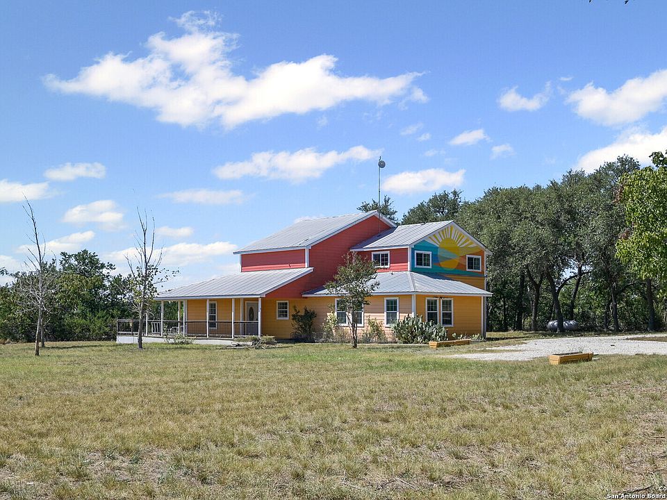 Tucked away in the peaceful Texas Hill Country just outside Blanco, this welcoming 5 Acre Texas Country home in Rust Ranches blends comfort, privacy, seclusion, space, and country charm. The owner calls it the "The Sunshine House" and you will see why and it will not be the fact a sunrise mural is painted on the north side of the house either! It's the kind of place that feels good the moment you walk in, bright, open, and full of natural light. The kitchen is thoughtfully designed, ideal for cooking and gathering with family and friends along with a very large oversized gas range to really get that ranch cooking going strong! With two spacious living areas, there's plenty of room to relax, entertain, or simply unwind after a long day. Two of the bedrooms even feature their own cozy sitting areas perfect for reading, working, or just having a little extra space to call your own. Did we mention the owner's retreat has it's own kind of spa like feel with river stone walls surrounding the massage jetted soaking tub and an enormous large walk in shower? You will feel like you're pampered at home and never want to leave! Step outside to enjoy quiet mornings with a cup of coffee on the porch or evenings under the big Texas sky. Heck this property comes boasting a VERY large gameroom upstairs perfect for entertaining while separating the downstairs and upstairs spaces. Oh did we mention, one room is like a little cozy library room with a handpainted country mural on the wall and a full set up black lights behind it to REALLY make it pop? You will have to see this for yourself! Set on a beautiful stretch of land fully set with a 484 sq ft barn along with a 480 sq.ft. separate storage room; this property has SOO many directions you can take this with and really make it your own private country retreat! The gated entry with code and private drive deep into the property keeping the house secluded entirely from the main road is just what anyone wanting ultimate privacy will be attracted to! If you want to make it your own, this home offers the perfect balance of privacy and convenience close to local shops, wineries, and everything the Hill Country has to offer with the town of Blanco only a 8 min drive away.