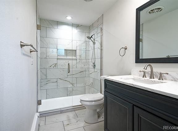 Gorgeous remodeled ranch home in the highly coveted Winston Downs subdivision. At almost 4000 finished square feet with two master bedrooms, this spacious home is one of the largest floorplans in the neighborhood. Interior highlights include brand new hardwood floors, high end stainless steel appliances, custom tile surrounds in all three bathrooms, master bath custom glass shower enclosure, quartz and granite counters, touch kitchen faucet, wine refrigerator, under cabinet lighting, wet bar in spacious basement, and wood burning fireplace with new tile surround. Brand new paint, flooring, fixtures, lights. etc throughout. Exterior highlights include brand new concrete driveway, professionally installed landscaping, front and backyard sprinklers, covered patio in rear, Ring doorbell, mature trees and shrubs create a private and secluded backyard feel. Great location just minutes away from Stapleton, Cherry Creek, tons of shopping and restaurant options.