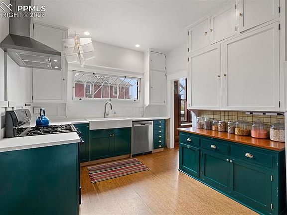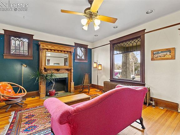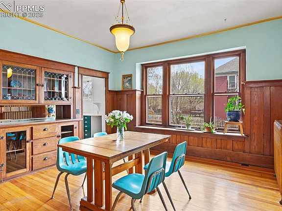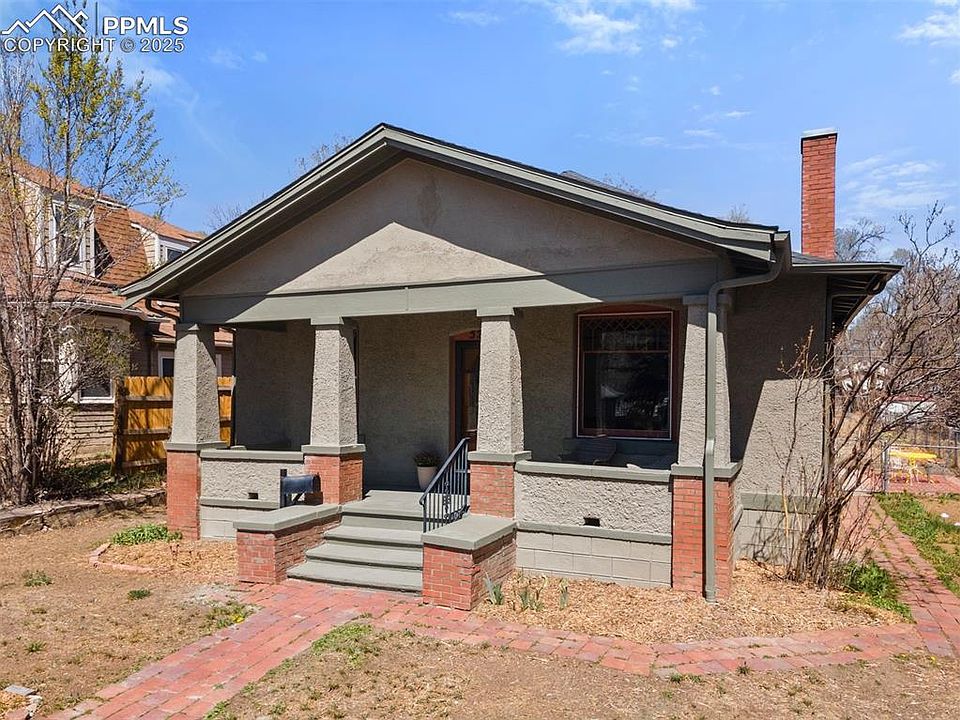 Step into a home where the past and present intertwine! This charming ranch-style home is a portal to a time when workmanship was revered, where every detail tells a story of craftsmanship and care. The stucco exterior sets the tone for a home that blends tradition with modern charm, and the rebuilt front porch invites you to linger. Inside, original hardwood floors whisper tales of the past, while the 9-foot ceilings and tall baseboards evoke a sense of grandeur. The dining room, with its built-ins and cozy window seat, is a refuge for gatherings, separated from the living room by a pocket door that adds a touch of nostalgia. The hand-carved fireplace mantel and tiled hearth are a testament to the artisans who once brought such beauty to life. The kitchen is where past meets present. Newer cork floors complement the rustic charm of a double farm sink, white quartz countertops, and modern appliances ensure that every meal is a delight with plenty of room for extended gatherings. Three charming bedrooms and a thoughtfully updated bathroom—designed to honor the home's history—round out the remaining spaces on the main level. Beyond the walls of this home lies a world of possibility. The spacious backyard is a canvas waiting for your touch, whether that’s a garden, a pergola, or simply a place to bask in the sun. The detached garage, accessible via the alley, with its additional workshop space, offers a convenient retreat for projects or hobbies. The 1200 sqft unfinished basement is ripe for transformation—whether as a studio, yoga space, storage, wine cellar or all of the above! Located in the heart of it all, yet tucked away on a quiet lot, this home is a haven that connects you to the vibrant pulse of downtown. Just a short walk to restaurants and shops, mere minutes from Old Colorado City, scenic Monument Valley Park, featuring some of the busiest pickleball courts in town, and the Legacy Loop Trail. This home is where stories are made and memories are forged.