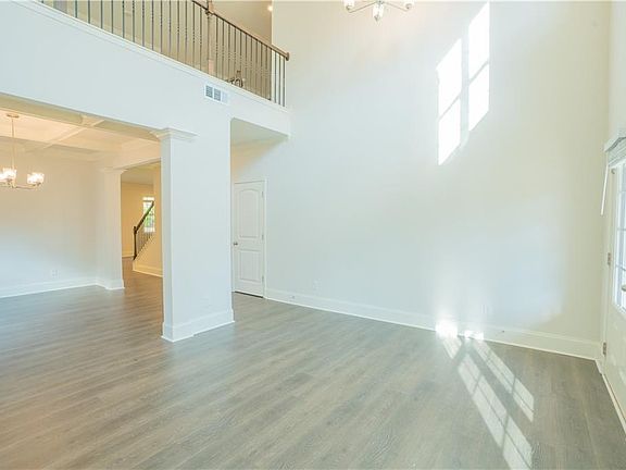 Beautiful like-new (built in 2022) and meticulously maintained single-family home offering 5 bedrooms and 4 full bathrooms in the highly sought-after Loring subdivision. A dramatic two-story foyer welcomes you inside, leading to a formal two-story sitting room and an elegant dining room. Gorgeous LVP flooring flows throughout the main level, opening into a spacious family room with a cozy fireplace. The open-concept design connects seamlessly to the gourmet kitchen, featuring rich cabinetry, a quartz island, and a bright breakfast area. A guest bedroom with a full bath and closet is conveniently located on the main floor.