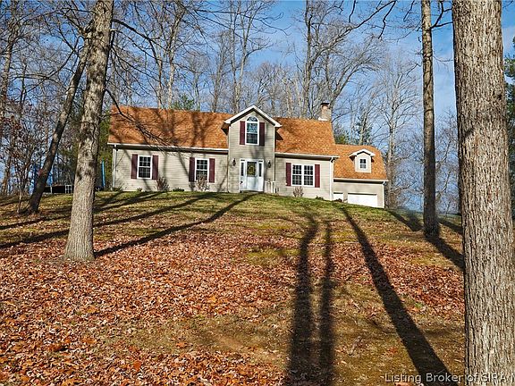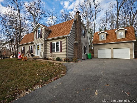 Lovely 5 bedroom updated home, in the Lanesville school district and close to the I-64 Lanesville exit. On a private lot with woods behind and ready for you. This home is a very short drive to the new Amazon distribution center and only about 20 minutes to Louisville. The large kitchen with Island and breakfast bar adjoins the dining area and is a wonderful place for the family and to entertain. A family room with a glorious wood burning fireplace is centrally located for all to enjoy. The Primary ensuite is on the main level and has 2 walk-in closets. 5th bedroom/nursery/office (no closet) sits right outside the Primary. Laundry/mud room is on the main level too. Upstairs are 3 bedrooms and a full bath with 2 sinks, plus a storage room. A 2 car detached garage has a large unfinished upstairs. Per previous owner, new in 2021: HVAC(2 heat pumps), roof, windows, long paved driveway and interior updating. Chimney cap and stove new in 2022. Seller is moving due to job relocation. They haven’t been here long and are sorry to leave this home and school system behind. Their loss is your gain. Water Softener, Refrigerator, dishwasher, stove and TV mount to stay. Trampoline does not stay. Sellers use Main Stream Fiber. One year HSA Home Warranty is provided.