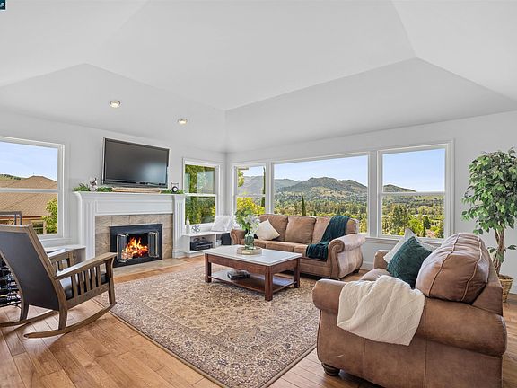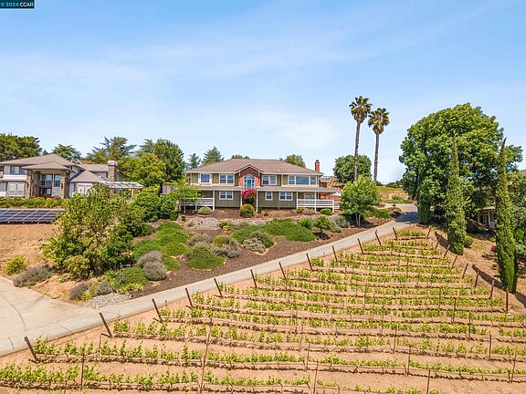 The most amazing VIEWS surround you at this elegant estate. Live in luxury on top of the hill with your own enchanting vineyard that graces the property. A rare blend of natural beauty & modern sophistication. Current home of "Vigneti Mirto." The vineyard, meticulously maintained, produces 3 different Italian varietals of grapes, adding a touch of Old World charm to this exquisite estate. Step inside to discover a harmonious fusion of space & style. The open-concept floor plan features a formal dining & living room, great room & billiards room, all bathed in natural light pouring in through large windows. The main floor offers a spacious primary suite with walk in closet & serene en suite with soaking tub, & more breathtaking views. The gourmet kitchen is a culinary haven, equipped with top of the line stainless steel appliances, a generous island, wet bar, and ample storage space. A wine cellar on the lower level is a haven for wine enthusiasts, offering storage for your collection. Outside, the entertainer's dream backyard beckons with a hot tub, expansive patios, owned solar, a terraced garden, & water feature creating a private setting for outdoor gatherings. Stunning panoramic views of Mt. Diablo & the Limeridge hills to enjoy from multiple decks & porches. Must see!