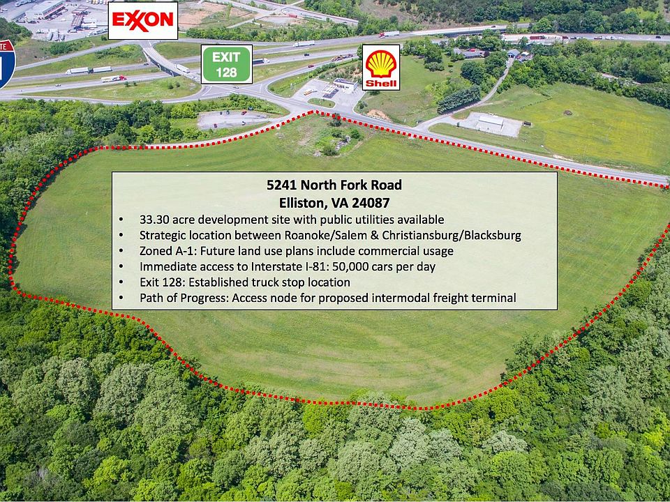 33.30 acre development site with flat to gently rolling topography with public utilities available. Located at Exit 128 (Ironto) with direct access to Interstate-81 with over 50,000 VPD. Strategic location at established truck stop destination between Christiansburg/Blacksburg and Salem/Roanoke. Currently zoned A-1, the future land use plan is for mixed use commercial development. The property sits directly in the path of progress at an access node to I-81 for a proposed intermodal freight terminal in Elliston. Perfect for a truck stop, hospitality use, or mixed use industrial or manufacturing facility.