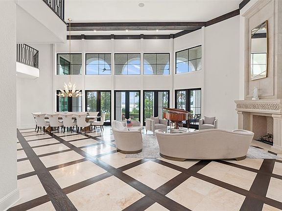Presenting a magnificent Isleworth golf front estate with sweeping lake views, perched above holes #2 and #9 and Lake Chase, combining a completely reimagined interior with designer elegance and modern grand style. With no neighbors on three sides, this stunning home offers a unique combination of privacy mixed with rare golf and water vistas. Home recently underwent a major “spare no expense” remodel by McNally Construction and design by Debby Dearth of McNally Design using the highest quality materials combining the latest designs with timeless Mediterranean architecture. Enter to an impressive foyer and Great Room with soaring 20-foot ceilings above and basket weaved marble and wood flooring below, complemented by wood beams, stone gas fireplace with marble mantle, and shimmering chandeliers. An adjacent cocktail bar next to the dining room is fitted with Cristallo quartzite counters and a temperature-controlled wine cellar that can easily accommodate 700+ bottles of wine. The well-appointed chef’s kitchen is fully equipped with a large center island, custom wood cabinetry, Italian dolomite counter tops, Sub Zero refrigerator, and a Wolf gas range with griddle. Family room and breakfast nook are perfectly sized for everyday entertaining with vaulted ceilings, reclaimed wood floors, and access to the pool patio and summer kitchen cabana. The dramatic first floor primary retreat features picturesque windows and a luxurious spa-like bath complete with chandelier, breakfast bar with Sub Zero fridge, dual vanities, garden tub, glass shower, and French doors to a walled outdoor space. The master closet provides access to a discrete room at the top of a spiral staircase that can be a gym, second study, or hidden Pilates room. Up the main staircase are three additional bedroom suites and a movie theater. An executive office is located on the first floor. Exterior living spaces feature a large covered lanai, heated saltwater pool, full pool bath, summer kitchen with stainless steel grill, sink, beverage refrigerator, custom-built stacked stone outdoor fireplace, and nearly 300 feet of golf frontage. Notable upgrades done in 2023 include a brand new tile roof, replacement of all custom doors and windows, remodeled kitchen, bathrooms with Kohler fixtures, door hardware, cocktail bar, flooring, Control 4 smart house features for lighting, electric shades, cameras, HVAC, pool equipment, garage doors, locks, built-in sound system, pool resurface, new pool heater, landscaping, complete interior and exterior paint, and exterior gray pavers. Home is built with concrete construction on both first and second floors. The 600-acre Isleworth community, surrounding the Butler Chain of Lakes, is a residential enclave that sets the standard of excellence for Central Florida living. Isleworth Golf & Country Club, which is located within the community, is recognized as one of the Top 100 Platinum Clubs of the World offering separate membership opportunities that provide access to golf, tennis, fitness, Clubhouse dining and social events, swimming in the resort-style pool and sundeck, dock, and an abundance of activities. Enjoy a lifestyle defined by casual elegance in a setting that sets the standard for luxury living.