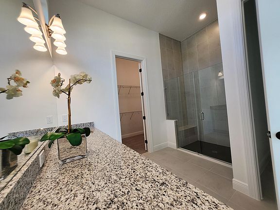 Spa-style bathroom with dual vanities, granite countertops, and a frameless glass walk-in shower with extended tile in Shower