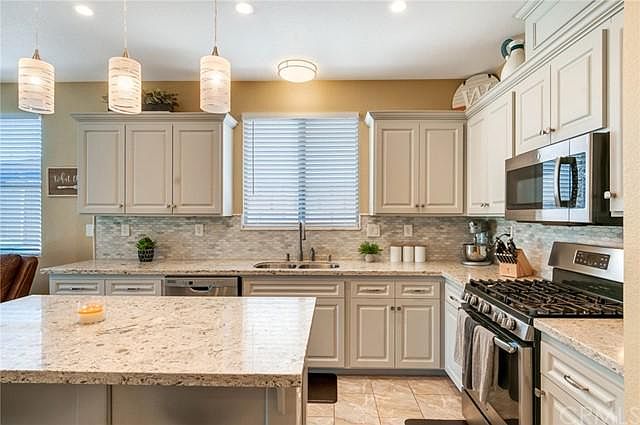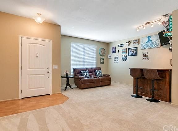 Beautifully upgraded single story Loring Ranch home with 3 bedrooms and 2 full bathrooms. Located across the street from the community park with a low maintenance front yard with new rain gutters and sprinkler/drip system. There is a front formal living room that has a built-in bar and open layout dining area that has new window blinds. The kitchen is the show stopper with a large quartz island. The recent kitchen improvements include: new painted/refaced white cabinets, quartz countertops, tile backsplash, under cabinet lighting, new pendant lights, stainless steel gas oven, microwave, dishwasher and sink. The open layout between the kitchen and family room make it great for entertaining. The family room has a remodeled fireplace with a new mantle, ceiling fan, window blinds, carpet, upgraded baseboards and sliding glass door to the backyard. The hall bathroom has a tub/shower, newly painted cabinet, hardware, quartz countertop, raised sink with brushed nickel faucet, new light fixture, new toilet and medicine cabinet. The laundry room is attached to the garage and has a good amount of storage. The hallway has newly installed recessed lighting, vinyl wood plank flooring and baseboards. All three bedrooms have new paint, carpet, ceiling fans and window blinds. The oversized master bedroom is large enough for a desk or sitting area at the other end and it has a sliding glass door to the backyard. The master bathroom is attached to the master bedroom and has been completely redone with: rain glass shower doors, new shower hardware, new vanity with granite countertop and backsplash, new lights, exhaust fan, medicine cabinet, mirror and toilet. The backyard boasts an outdoor patio cover with a new sprinkler/drip system, concrete, planters with landscaping for easy enjoyment and maintenance. Low HOA and low taxes also make this home a great purchase!