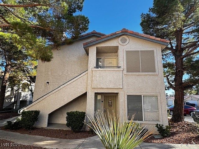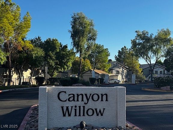Welcome to the gated community of Canyon Willows. This upstairs end unit has wood floors thru-out a large primary bedroom with a 7x6 walk-in closet and access to the balcony. Bathroom has double sinks and tub / shower combo. Open kitchen has breakfast bar and over the range microwave, living room has large slider to the balcony that is surrounded by large trees for a relaxing atmosphere! In unit washer / dryer. Convenient location only minutes to the famous Las Vegas Strip and Reid International Airport. Surrounded by shopping, restaurants, schools, parks and so much more.