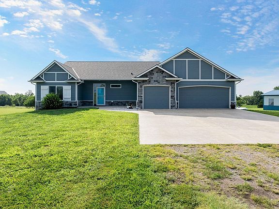 Welcome home to your share of the American Dream! Situated on 6.3 peaceful acres with water views, large shop, mature trees, and spacious grounds, it is clear this home is special. Built in 2017 by Warren Homes, this 4 bedroom, 3 bath country home is like new and move in ready! Just imagine tranquil mornings watching deer and wildlife from your window or evenings relaxing on your deck overlooking nearby ponds. Imagine enjoying a majestic sunset or watching a Kansas storm roll in. Imagine your own private retreat with room for kids to play, or simply enjoying the beautiful seasons away from it all. Imagine chickens, gardens, campouts, and stargazing! Inside the appeal is amazing with modern white trim, engineered wood floor throughout, and an agreeable layout. the kitchen is GORGEOUS with elegant white cabinetry, farmhouse sink, stainless steel appliances, granite tops, and under cabinet lighting. And any chef will feel right at home with the quality gas range, large center island, and HUGE walk-in pantry! Next to the living room is a four seasons room with large picture window, perfect for reading a book, conversations with friends, or warming body and soul next to the gas fireplace. The Master bedroom is generous with beautiful property views. The master bathroom is sure to please with sprawling countertops, double sinks, and ample cabinet space. The large master closet is complete with a vanity and built in shelves. Bonus: the closet is also attached to the main floor laundry. Downstairs the appeal continues with gently sloping steps, two more bedrooms, large living area, and walk out access with lots of natural light. There is also TONS of space for storage, it just keeps going! I could go on about the Culligan water softener and RO system, large shop, wheelchair accessibility, convenient drop zone, and 95% efficient furnace, but your really need to see for yourself. See you soon!