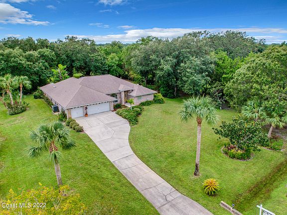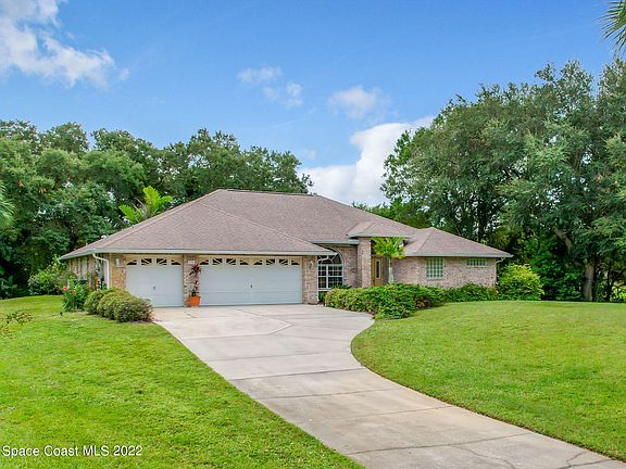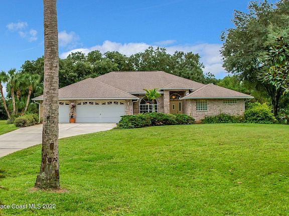PRETTY 3-bed/3-bath/3-garage POOL HOME NESTLED on a PRIVATE & SERENE 1.08 ACRES! Feel Secure in this 2224 sq.ft. Sturdy Concrete dwelling with Brick exterior, Energy efficient Doors & Windows including shutters & a 2020 Roof. Plenty of Gathering Space at the Kitchen Breakfast bar or Eat-in area, all open to the Family room. This Airy Split-Plan Layout has 3 bathrooms & 3 full baths – two of which are Ensuite. Large Master Bedroom features his/her Closets & a Glass Slider leading out to the Lovely Lanai. Fix your drinks & Retreat Poolside in your Peaceful Backyard with Space for Family, Friends, & Pets to Play. The 3-car Garage & Long Driveway creates room for your Boats or RV. No HOA! Enjoy Country Living in this Newer section of Canaveral Groves but with the perks of an easy commute. commute.