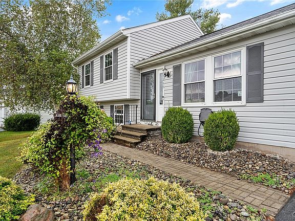 This 1,724 sq ft split-level in Clay is built for entertaining, both indoors and out. The backyard is a true retreat, featuring an inground saltwater pool, pool house for storage, a firepit for cozy evenings, and a HUGE grass area for gatherings. This yard is fully fenced a true dream for your furry friends. Through the two-car attached garage, step inside and you’ll be greeted by the beautifully updated kitchen, complete with a breakfast bar, island, and all newer appliances, including a sleek gas stove. Soundproofed flooring adds a thoughtful touch and ensures peace and quiet. Just off the kitchen, the heated sunroom offers year-round enjoyment with a woodstove and six sliding glass doors that flood the room with light. This offers a panoramic view of the entire backyard. On the opposite side of the kitchen, there is a formal dining area that is spacious enough for any sized table you would like! Upstairs, you’ll find three bedrooms and a full bath. The master bedroom is generously sized, comfortably fitting a king bed with plenty of space to spare. The lower level includes another full bathroom and a finished area that the seller has partially converted into an office. The office area includes an additional wood stove. The laundry is tucked away in the basement, which is partially finished and has the potential to be converted into even more living space. The home is heated with forced air and the central a/c unit keeps the home cool year round. With its modern updates, versatile living spaces, and exceptional backyard, this home is a true gem waiting for its next owner.