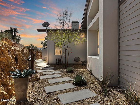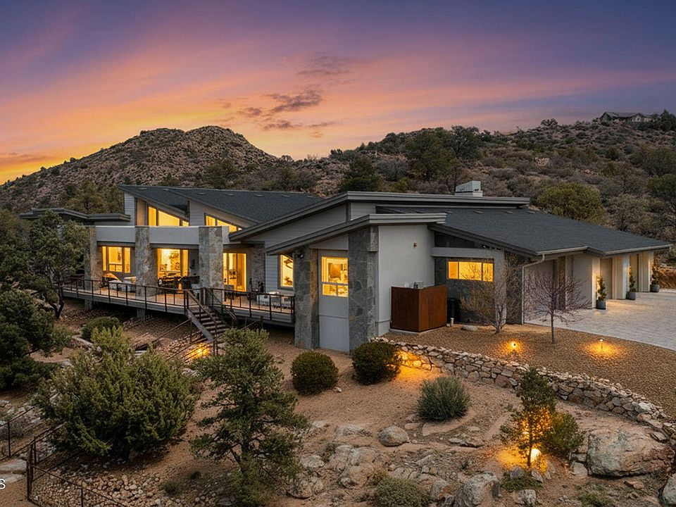 Experience a masterclass estate of contemporary architecture, secluded on a prime 2.47-acre hillside within Prescott's most exclusive guard-gated enclave. This 3,400 sq. ft. sanctuary is a celebration of glass, light, and geometry, specifically oriented to capture a spectacular 180-degree panorama of the Santa Maria Mountains.**Uniquely curated Luxury Interiors**Modern Aesthetic: Sharp lines and soaring ceilings are grounded by cool porcelain floors and anchored by a striking dual-sided hearth**Epicurean Hub: A sleek, high-performance kitchen boasting a professional Thermador suite, waterfall quartz surfaces, and bespoke cabinetry**Refined Social Spaces: A lounge-style wet bar with wine refrigeration and integrated art lighting sets the stage for sophisticated gatherings**An Elevated Outdoor Oasis: The massive sky-deck functions as an outdoor living room, featuring a granite-topped social bar and integrated audio--all while floating above the rugged landscape. The expansive lot ensures total tranquility, including a private, fenced pet retreat**The Lifestyle: Life in this Troon-managed community offers unparalleled leisure: including championship golf, swimming pool & spa, exceptional fitness facility, pickleball/tennis, hiking trails and fine dining. This is a rare opportunity to own a modern work of art in a high mountain desert paradise.