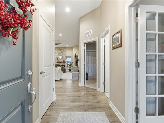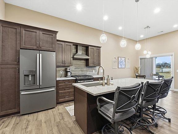 Custom Townhome with Serene Pond Views and Main Floor Living! Zero entry! Many upgrades in this beautiful 2 bedroom, 2 bath and bonus room/office. Kitchen features gas stove with air fryer, hooded vent, drawer microwave, quartz countertops and large island. All appliances stay. Cozy primary suite with tile shower and a bench seat, heated tile flooring and walk-in closet. Main bathroom had tile shower, jacuzzi heated tub and heated tile flooring. Living room feels spacious with 11 ft ceiling, can lighting, ceiling fan and electric fireplace. Laundry room features wash sink, well lit pantry and built in ironing board. Step outside to the covered patio with remote screen, gas hook up and easy care epoxy coating. Two car garage is heated with easy clean epoxy floor coating.