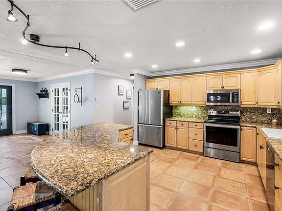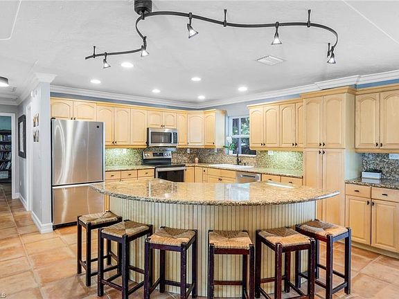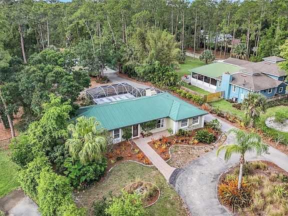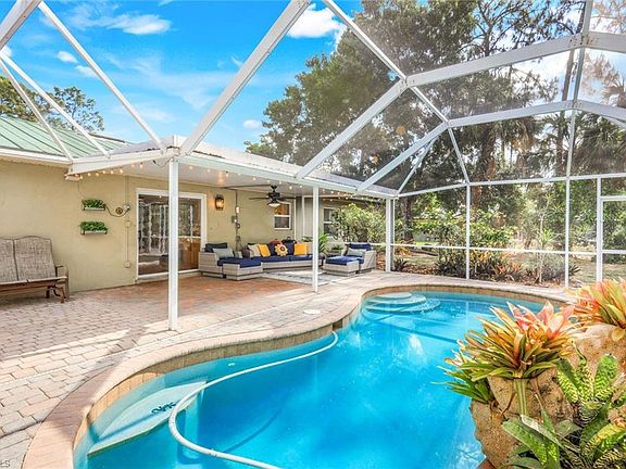 Tucked away on 1.59 acres in one of Naples’ most desirable and safe neighborhoods, this stunning property offers the ideal blend of peace, privacy, and modern comfort. Zoned for top-rated schools and surrounded by natural beauty, this is more than just a home—it’s your private oasis. The main house features 4 spacious bedrooms and 3 full bathrooms, thoughtfully updated with fresh paint throughout, baseboards, crown molding, and refreshed grout for a polished finish. The impact-rated front door adds security and style, while new lighting fixtures brighten every space. Step outside to your expansive screened lanai, perfect for entertaining or quiet evenings under the stars, and enjoy the sparkling pool—your own backyard retreat. You'll love gathering around the firepit, strolling along the cleared bike trail, or simply enjoying the tranquil, fully landscaped surroundings adorned with fruit trees. But that’s not all—this property also includes a fully detached 2-bedroom, 1-bath guest house. Freshly painted and full of charm, it’s ideal for visiting guests, extended family, or a fantastic income-generating rental opportunity. Additional features include: Whole house reverse osmosis system (2022), gutters and downspouts, RV hookup for septic and water, Roof straps for added storm protection, Plywood hurricane shutters for all windows, Fresh traction gravel in front of the back storage shed, Recently insulated attic and Detached shed for extra storage or workshop use Whether you're hosting friends by the pool, relaxing in your peaceful backyard, or exploring new possibilities with the guest home, this property checks every box. Don’t miss your chance to own a rare gem in North Naples with space to breathe, grow, and entertain. Welcome home!