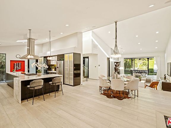 Luxury and style converge in this Sherman Oaks dream home! This contemporary retreat offers incredible curb appeal with sleek lines and a sophisticated design. Situated on a quiet street, it immediately impresses with vaulted ceilings and skylights upon entry, creating a bright and airy atmosphere. The sunken living room, anchored by a cozy fireplace, serves as the centerpiece of the home, perfect for relaxing or entertaining in style. Featuring 4 bedrooms and 3.5 bathrooms, this home is ideal for those who appreciate open spaces and a seamless indoor-outdoor flow. The custom kitchen is a chef's dream, featuring a 16-foot T-shaped island, custom cabinetry, porcelain countertops, and Jenn-Air stainless steel appliances. The expansive primary suite upstairs offers a walk-in closet with a makeup station, while the luxurious spa-like bath features a black floating vanity, Italian marble, and a double steam shower with teak floors. Throughout the home, strategically placed lighting enhances the aesthetic, casting a cool, inviting glow that serves as a perfect accent. Outside, the backyard sanctuary features a covered patio with an outdoor living room, complete with a TV, surround sound, and a linear fireplace. A trellis-covered seating area and custom-built Argentine BBQ are perfect for alfresco dining, while the custom pool with Baja shelf, spa, and relaxing waterfall offer a tranquil vibe. This smart home can be fully controlled from your phone or Alexa, allowing you to manage the 3-zone in-ceiling speakers, security cameras, A/C, pool/spa, lighting, and more with ease. This home is built for energy efficiency, featuring solar panels, low-maintenance artificial grass, and a tankless water heater-an eco-friendly blend that keeps utility costs low and green living simple. This is a rare opportunity to own a true gem-an impeccably designed retreat that blends luxury, comfort, and cutting-edge technology in one of Sherman Oaks' most desirable locations.