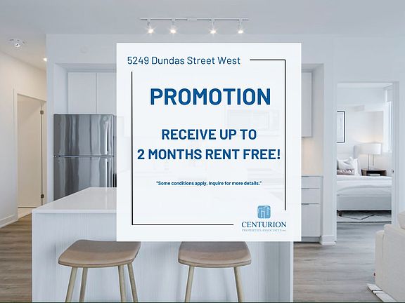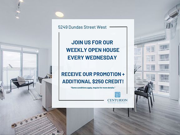 About5249 Dundas Street West is a prestigious rental community located in Etobicoke on the corner of Dundas St. W & Kipling Avenue, minutes away from Kipling Station. These extra-large suites offer premium features and unbeatable square footage & views. 5249 Dundas Street West is conveniently located minutes from HWY 427, and offers interior access to Farmboy! Let 5249 Dundas Street West be your next destination stop for luxury living in Etobicoke.Visit our weekly OPEN HOUSE every Wednesday from 11AM-5PM.Apply within 24 hours of attending the Open House to receive our promotion + an additional $250 credit! *Some conditions apply, please inquire for more details!PROMOTION: Receive up to 2 months rent FREE!*Some conditions apply, please inquire for more details.*Looking for a future move-in date? Give us a call today to speak with one of our Customer Care Representatives to find out more!Suite Offer modern finishes throughout including;Full-size kitchen appliances including; fridge, stove, dishwasher, microwaveFull-size washer and dryer In-suiteMirrored doors in bedrooms and common areas Stand up glassed in showers with modern fixtures - its like an oaisis!Storage space in and outside of the suite**Balconies with incredible views of the water, downtown etc. Chat with our team onsite to select your ideal view!This amazing property offers unbeatable amenities onsite fit for everyone.Our property is pet friendly including an outdoor pet run and wash station - perfect for the cold winter days!Underground parking for guests and residents**Secured entrances with 24-hour concierge Indoor rentable community room perfect for entertaining **Outdoor Infinity Pool for the warmer months - Hang out and get a great tan or take a dip right onsite!Fully equipped fitness facilities; just a short elevator trip to your included gym facilities including state-of-the-art equipmentOnsite Kids play area for when you need a little extra space for the kids to playYour Community Offers:Walking Distance (TTC Kipling Station & Kipling GO Station)Access to major highwaysFarmboy and other commercial amenities onsiteNewly developed Cloverdale Mall mins awayOn-site Grocery store and commercial spacesFees:*Hydro and Water not included*Underground Parking: $125/month*Locker: $50/monthSuite images shown represent standard unit finishes, which may differ between units. Suite layout varies.