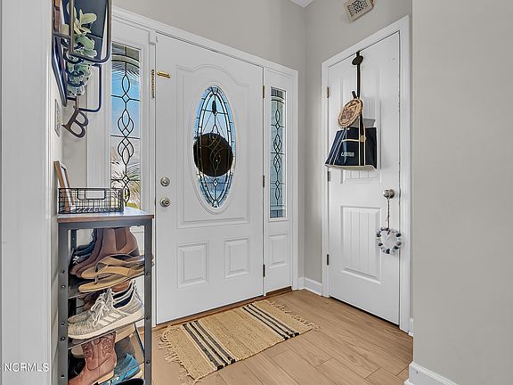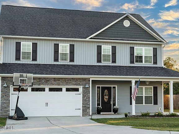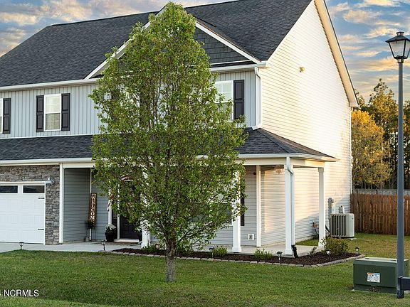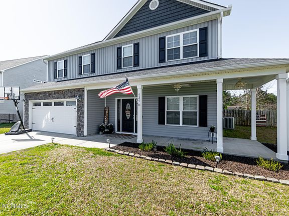 Indulge in luxurious living within this stunning 4-bedroom, 2.5-bathroom home set on 1.27 acres of picturesque landscape. This home is conveniently located just 8 minutes to Hubert base gate and under 20 minutes to multiple beaches. Enjoy the convenience of his and her closets and a remodeled owner's suite bathroom. Entertain effortlessly in the spacious open floor plan, complete with eat-in kitchen featuring granite countertops and a spacious pantry. A flex room downstairs offers versatility, while the 2-car garage and shed provide ample storage space. Recent upgrades include flooring replacement throughout in 2023 and a fresh coat of paint in 2023/24. Updated appliances, including a fridge, stove, and microwave, enhance the kitchen's appeal. Each bedroom boasts a walk-in closet, and the laundry room is conveniently located upstairs. Outside, a fenced backyard with a covered porch and built-in fire pit invites relaxation. The gated neighborhood amenities include a pool with clubhouse, basketball court, playground, and walking trail.