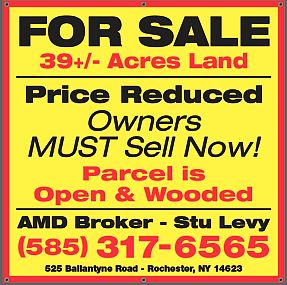 For Sale - Land - 39+/- Acres in Chili - Price Reduced ! Make your dreams come true today ! This 38.92 Acres in Chili, NY near Monroe County Airport is suitable for all kinds of outdoor activities. The former amateur sports facility can be used for hunting, fishing, water fowl, and includes wildlife such as, Owls, Hawks, Eagle, Canadian Geese, Mallards, Other Water Foul, Deer, Muskrats, Beavers, Otters, Garter Snakes, Raccoons, Possums, lots of Turkeys, Bobcat and more ! This Parcel has easy access, two road frontages, can be used as a hunting camp, training facility, sports camp, youth sports facility, or many other possibilities. Tax Appraised for $225,000.00 this parcel is value priced at Only $145,000.00. Owner financing available with adequate deposit on sale. Priced to sell immediately. Location is 525 Ballantyne Road, Route #252, Rochester, NY 14623 (( Google Maps )) On the corner of Ballantyne Road and Archer Road in Town of Chili, NY Please contact AMD Brokerage, Stuart Levy at 585-317-6565 Today. It is certainly worth a look today before it sells to someone else.