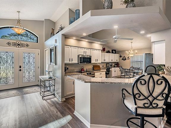 RENOVATED, REMODELED and READY for YOU! Over $100,000 in NEW Updates!! Move Right In to this beautifully updated Nightingale floor plan which is Perfectly situated on a quiet cul-de-sac in The Wellington at Seven Hills... a premier 55+ GATED community, known for its resort-style amenities and carefree living. Enjoy the convenience of MAINTENANCE FREE living in this immaculate home featuring 3 bedrooms, 2 baths, and a 2-car garage with Screened in LANAI Overlooking a Peaceful, Private Backyard! Elegant double-door entry opens into a welcoming foyer with a coat closet that opens to an expansive, OPEN CONCEPT layout. Soaring cathedral ceilings enhance the spacious feel throughout the main living areas. The formal dining room is accented by a bright bay window, while the extended eat-in kitchen offers Gleaming Granite counters, abundant workspace, additional cabinetry for storage or buffet service, new hardware and fixtures, large breakfast bar and a closet pantry. The remodeled kitchen features new 2025 Frigidaire Gallery stainless steel appliances and overlooks the great room which leads to the covered, screened lanai... perfect for relaxing or entertaining while enjoying the private backyard with no rear neighbors and peaceful treed views. The primary suite provides a private retreat with two closets, dual sinks, and a large snail shower illuminated by a skylight. The split-bedroom layout ensures privacy, with luxury vinyl plank flooring throughout most of the home. The third bedroom is currently used as a den or home office, offering versatility to fit your lifestyle. Remodeled bathrooms are STUNNING with a neutral casual elegance feel! ROOF is 2016, HVAC system 2015, Energy-efficient tinted windows added to front of home, exterior paint 2022, and enhanced landscaping adds to the home’s outstanding curb appeal. Residents of Wellington enjoy a vibrant lifestyle with access to a beautifully maintained clubhouse, sparkling pool and spa, fitness center, library, and numerous clubs and activities. Sports enthusiasts can enjoy pickleball, tennis, bocce, and billiards, while the on-site Bar & Grill offers delicious dining just steps from home. Maintenance services include lawn care, fertilization, trimming, exterior painting, roof, cable, and a 24-hour manned gate, ensuring peace of mind and effortless living. Conveniently located near shopping, restaurants, hospitals, and just minutes from the Suncoast Parkway, this home offers the perfect blend of comfort, style, and convenience—all in one of Hernando County’s most sought-after 55+ communities. MUST SEE this home and all the community has to offer so you can LIVE like you are on Vacation Everyday! CALL TODAY!