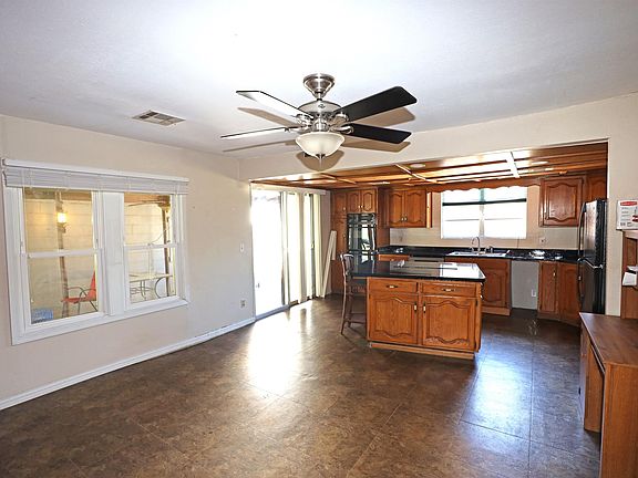 Sited on a hill the front porch provides views of the surrounding neighborhood. The huge front and side yard areas with trees allow room for gardening or other activities. There are three bedrooms, one large bathroom/laundry combination, living room with a lot of natural light from the windows, and a very nice size kitchen/dining combination. The kitchen features an abundance of cabinets and an island with cooktop and storage. The walkout to the breezeway patio gives easy access for outdoor dining or just enjoying the fresh air in a shaded environment. There is a 2 car carport. First, last and deposit of $1,000 for possession. Call now to schedule a viewing.