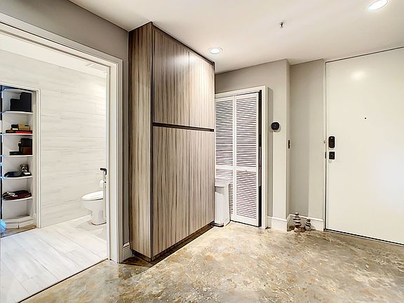 Modern condo re-designSealed wood waterfall barElectronic somfy custom draperySonos surround sound systemBuilt-in custom dining tableKeyless entryEcobee thermostat