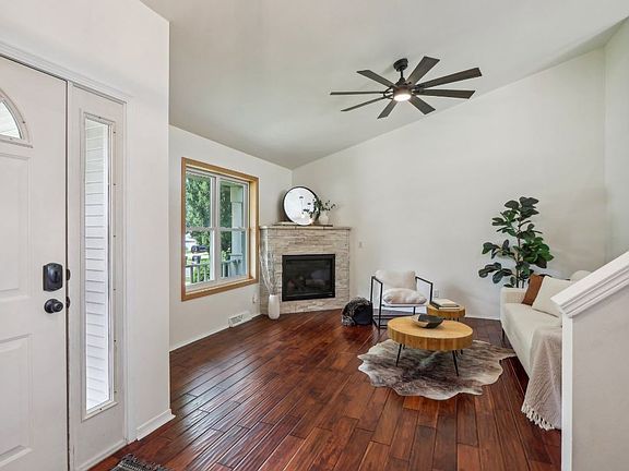 Gas fireplaceKitchen islandFenced in yardNew appliancesWood flooringLovely front porchCentral ac