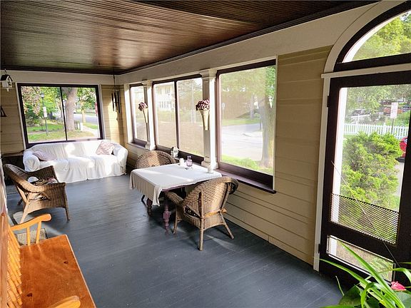 accented by a coffered ceiling, bay window, and chandelier. Entering the kitchen you will find cherry cabinets, under cabinet lighting, additional bar sink area with lighted glass front cabinets. Built in refrigerator, 5 burner gas top stove, microwave nook makes this warm kitchen a delight to work in. Grand staircase leads to upper hallway with built-in cupboards & drawers. Large Primary Bdrm suite can accommodate large furniture, Jack & Jill walk in closet for your convenience & an attached bath. Bedroom #2 has built in cupboards in closet. 2nd floor laundry, all season sunroom with 3 walls of glass windows for plenty of light. 3rd floor: two cozy bdrms with original claw tub and two large built in cupboards. Two car garage with loft.