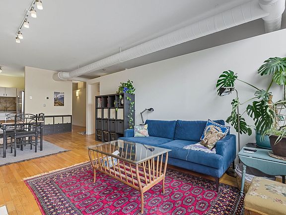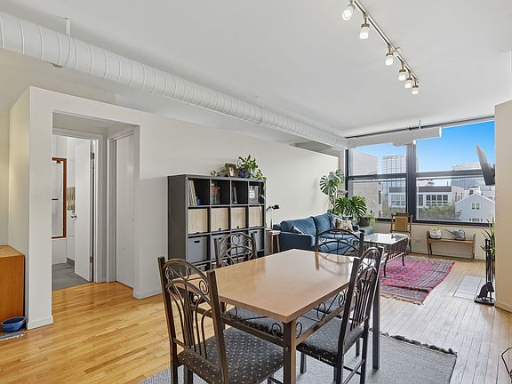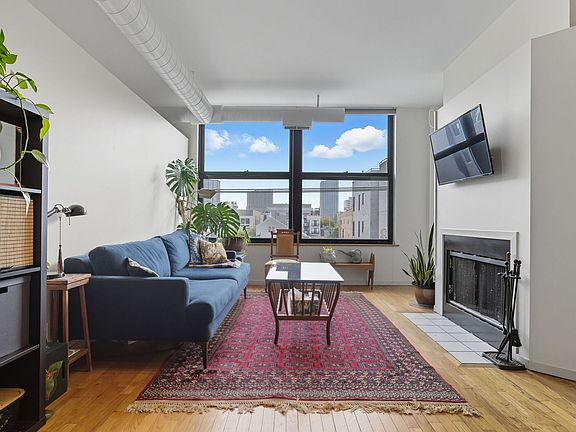 TOP FLOOR River West / Noble Square loft - Oversized south facing windows bring enormous Natural Light in Unique Complex with Dramatic Lobby & Entry! New AC, Smart Thermostat, Just fully professionally painted, New Washer and Dryer! Open Flowing Living Space with Hardwood Floors with White Kitchen with Stainless appliances. Bathroom received spa-like upgrade in 2023! Spacious master bedroom with oversized closet, plus large 12ft X 8ft Den(Many unit owners claim this as a second bedroom). Modern U Kitchen with Dining space overlooking Cozy Wood Burning Fireplace! Absolutely amazing common roof deck with gorgeous City Skyline views, Lounge Chairs, Tables, and Gas Grill for all those outdoor dining meals! Convenient location near downtown, trendy restaurants, mass transit etc.