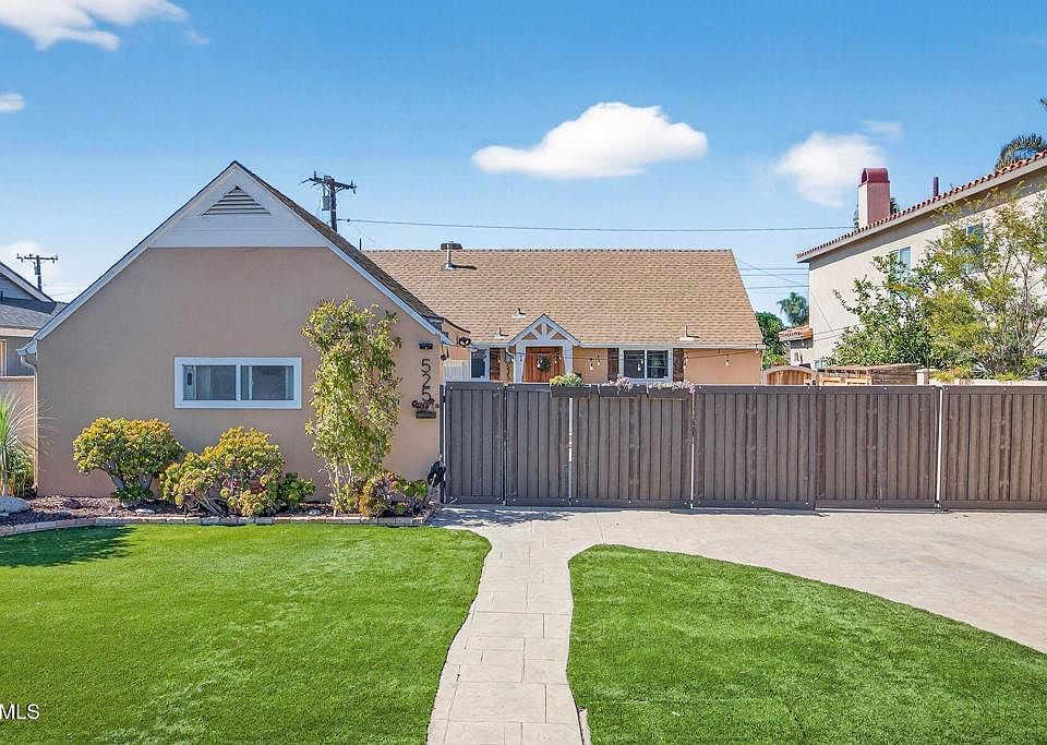 Tucked behind a private gated courtyard in North Oxnard, this beautifully refreshed 3 bedroom, 2 bath ranch-style home offers stunning & modern upgrades while preserving the timeless characteristics of its mid-century era. The residence welcomes you inside with original hardwood flooring, undeniable charm, and an open family-friendly floorplan. The upgraded kitchen is complete with newer appliances, modern butcher block countertops, views of the front courtyard, and a spacious counter bar that opens to the living and dining areas- perfectly designed for connection and gathering with family and friends. Large glass sliders invite you outdoors to the private covered patio and backyard--an ideal setting for evening barbecues, hosting family, and endless outdoor fun. Down the hall are three well-sized bedrooms, including a large guest bath and primary retreat with newly renovated ensuite bathroom featuring a glass enclosed shower with soaking tub, large vanity, all new fixtures, and designer tile flooring. The expansive gated courtyard serves as an outdoor extension of the home--perfect for entertaining, lounging, or a safe play area for kids. Don't miss the converted garage studio with kitchenette & full bath, a versatile bonus space ideal for guests, multi-generational living, or potential rental income. With stone-core wood like flooring and a functional garage door, it conveniently doubles as either an elevated living space, or 2-car garage.Additional highlights include newer tankless water heater, upgraded electric panel, inside stackable laundry, smart home features, owned water softener, dual paned windows and recessed lighting.Ideally located near schools, parks, shopping, and just minutes to Oxnard's beautiful beaches, this home offers both comfort and connection for everyday family life. Discover the perfect place to put down roots and make lasting memories in the heart of Oxnard.