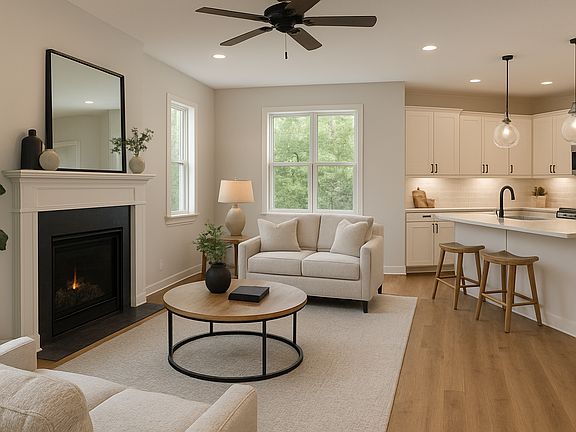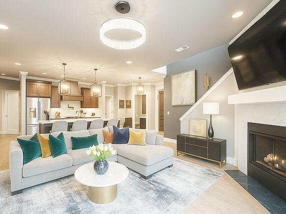 Office roomContemporary lightingOpen-concept layoutCozy fireplaceUpscale finishes