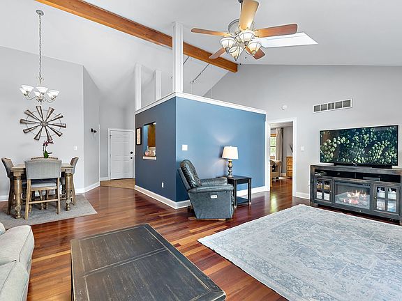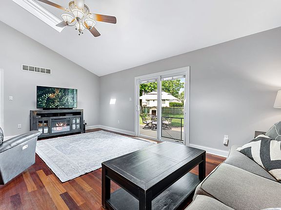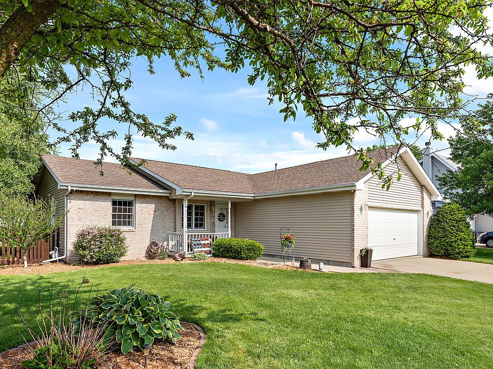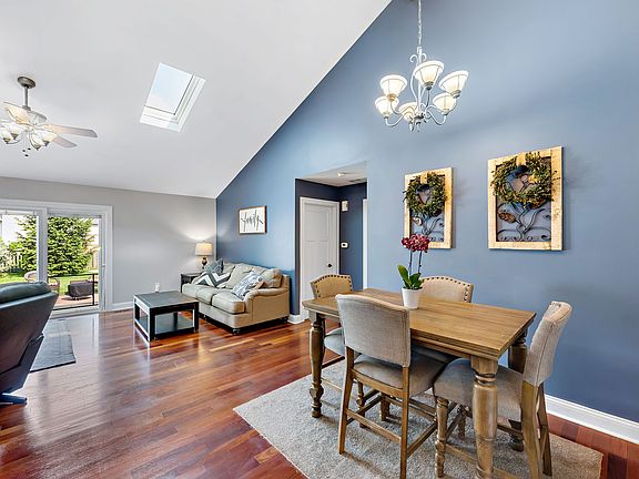 Looking for a MOVE-IN ready home in Manteno? This 3 bedroom, 2 bathroom, split floor plan home is for you! The main area contains the dining room and living room, featuring hardwood flooring, high vaulted ceilings, skylights, and patio door offering tons of natural lighting. Behind a shared wall, is the kitchen, with stainless-steel appliances and ample cabinets for storage. Off the kitchen is a cute built-in banquet providing extra seating for family and guests! On one side, is the spacious freshly painted master bedroom with hardwood flooring and a large walk-in closet. There is a lovely renovated full bathroom. On the opposite side are the two additional bedrooms, both freshly painted, and another lovely renovated bathroom. First floor laundry too. Heading outside is an extended patio, and large fenced-in backyard, a great area for summer entertaining! Outdoor shed for storage, attached 2 car garage, some new windows, newer AC, and roof around 10 years old. Neighborhood park across the street, and not too far from Downtown Manteno, with great shops, restaurants, and parks. This is a GREAT find, so call today for your private showing!