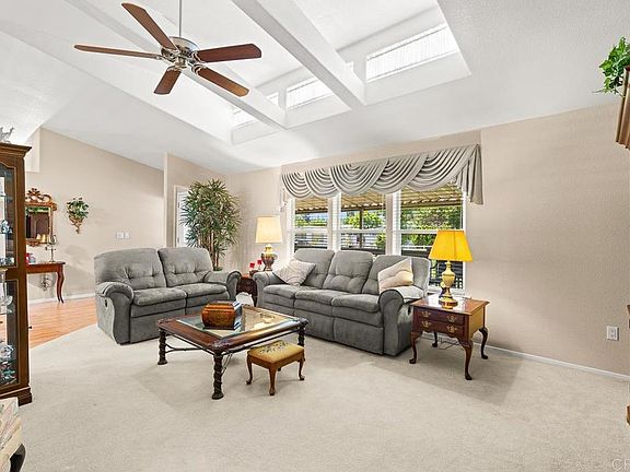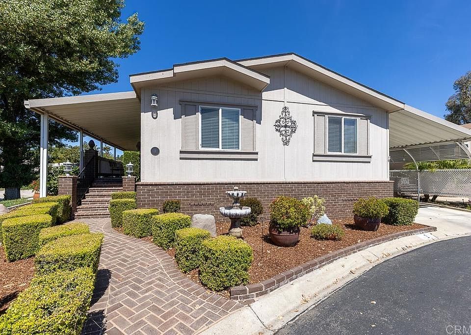 Welcome to RANCHO ESCONDIDO a land owned, no space rent, manufactured home community. GREAT FLOOR PLAN, 2 BEDROOMS PLUS AN ADDITIONAL DEN/ OFFICE ROOM 2 BATHROOMS with showers ( ADDITONAL ROOM DEN/ OFICE is next to the 2nd BR and has a door but no closet) LOTS OF CURB APPEAL! Custom brick walkway and front stairs leading to your main entry. A corner lot with the homes orientation over looking the green belt. Lot's of windows to enjoy the views along with a large covered deck. The primary suite is located on the opposite side of the home from the other 2 bedrooms with the Kitchen, dining room, living room and laundry room in between. The primary bedroom boasts a large walk in closet and a roomy ensuite. Big kitchen has a large island with seating, additional cabinetry and a real butcher block space at one end. Cabinets galore! 1st time on the market, lovingly kept by original owner. RANCHO ESCONDIDO is gated and has many amenities and social activities, 2 pools, 2 club houses, a spa, a workout room, a card and billiard room, a dog park and more. Come take a tour TODAY, you'll be happy you did! Located in N Escondido convenient to all. 1 pet allowed with particulars.