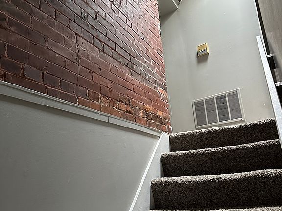 A staircase with a stunning exposed brick feature wall leads to the second level, where you'll find spacious bedrooms with generous closets and a luxurious bathroom complete with a jacuzzi tub, extra-large double vanity, and oversized linen closet.