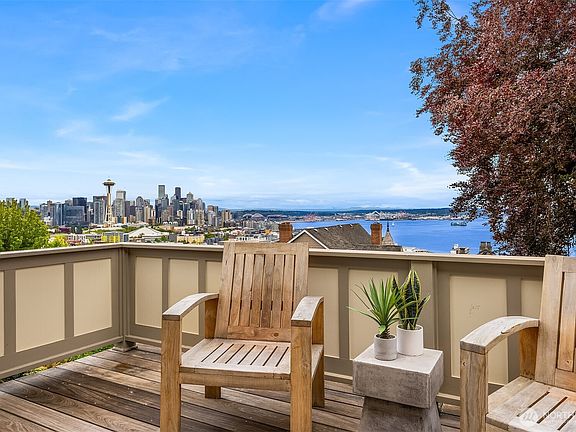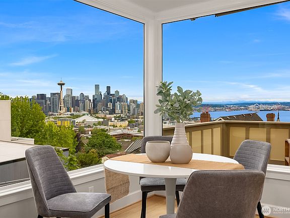 Breathtaking panoramic views + a magnificent backyard garden make this stunning Penthouse a truly unique opportunity. Nestled in an exclusive boutique building with just one other unit, enjoy the benefits of condo living + the charm of Queen Anne's premier residential neighborhood. Savor views of the cityscape, Space Needle, Olympics, Mt. Rainier & Puget Sound from the deck or retreat indoors to the cozy fireplace & never leave the view! Gorgeous remodeled chef's kitchen w/waterfall quartz counters & gas stove. Primary Suite w/ 5-piece bath, Juliet balcony & walk-in-closet. Spacious 2nd bedroom & 3/4 bath. Private guest room or office/media room with half bath on the lower level. Lots of storage & designated parking. No Rental Restrictions!