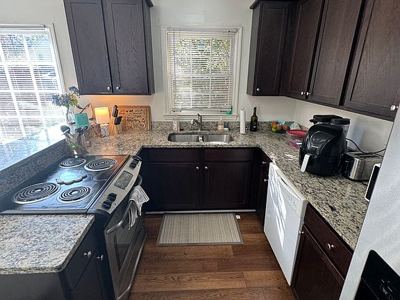 Hardwood floorsStainless steel appliancesGranite countertopsDark wood cabinets