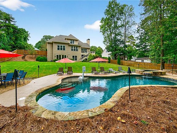 WOW!! NO HOA DREAM HOME .7 MILES FROM GA 400! This stunning estate-style retreat sits on just over half an acre and is loaded with amenities, including a heated Gunite pool with an elevated spa, a cozy fire-pit area perfect for fall evenings, and a six-zone irrigation system perfect for low-maintenance landscaping. Enjoy wooded privacy, a creek, and plenty of backyard space. Inside, hardwood floors flow from the private home office to the heart of the home — a dramatic living area with custom beamed cathedral ceilings and a warm stacked-stone fireplace. The chef’s kitchen boasts stainless steel appliances, a gas cooktop, pantry, breakfast bar, and center island, all overlooking the gorgeous backyard. The main level features two full bathrooms, a spacious guest suite, and a luxurious primary retreat with a spa-like ensuite offering a soaking tub, dual vanity, and separate shower. Upstairs you’ll find three additional bedrooms, including a Jack-and-Jill bath setup. The finished basement seals the deal with 10-foot ceilings, a full bath, game room, media/family room, workshop, and plenty of storage. Plus, the dedicated golf room is 100% ready for you to enjoy year-round fun!Extra perks include boat/RV parking, motorized blackout shades, Ethernet wiring, and thoughtful upgrades throughout. And if that’s not enough, this home is conveniently located .7 miles from GA 400 access, 1.2 miles from NoFo Brewery, and minutes from The North Georgia Outlet Mall, excellent shopping and dining. This NO HOA gem checks all the boxes for luxury, privacy, and entertainment.
