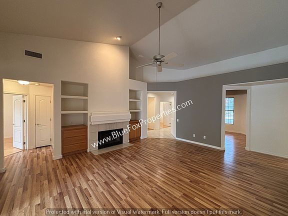 Welcome to this beautifully 4-bedroom, 3-bathroom home, designed with a neutral color palette and filled with natural light throughout! Step inside to a warm and inviting entry hall that opens to a versatile office space with built-in shelving and a comfortable family room. The expansive living room also features built-in shelving and an adjacent Jack-and-Jill space. The well-equipped kitchen includes a built-in microwave, stove, refrigerator, dishwasher, and ample cabinetry, with a dining area conveniently located nearby. Laundry room offers a washer and dryer combo along with additional cabinet storage. The primary suite is a true retreat, featuring a spacious en-suite bathroom with a double-sink vanity, soaking tub, separate standing shower, private toilet room, and a generous walk-in closet. Step outside to enjoy the backyard complete with a covered patio, ideal for relaxing or hosting gatherings. (Please note: the locked storage room in the backyard and the drained jacuzzi are not for tenant use or access). A spacious 3-car garage adds to the convenience of this charming home.
